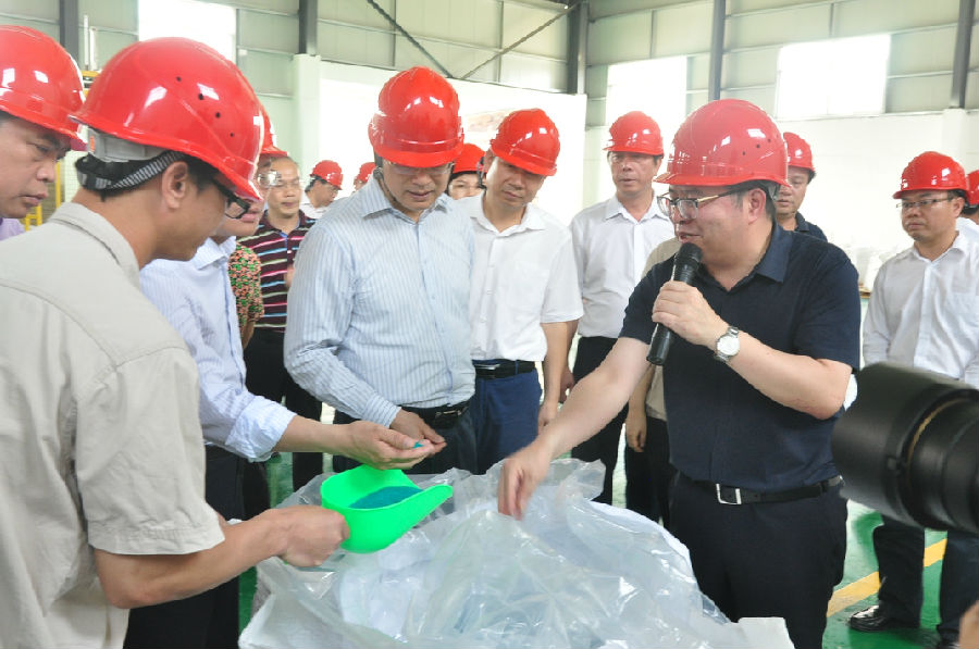 玉林市市委書記莫恭明、市長(zhǎng)蘇海棠一行在參看鎳鹽車間剛產(chǎn)出的六水硫酸鎳產(chǎn)品