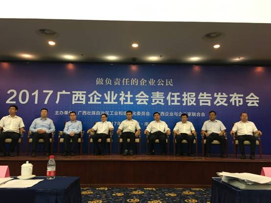 2017年6月15日,來自廣西各地的代表企業(yè)、社會責任工作專家、新聞媒體記者以及相關(guān)部委與行業(yè)協(xié)會領(lǐng)導(dǎo)共聚國際會議中心新聞發(fā)布廳,隆重召開“主題為踐行‘創(chuàng)新、協(xié)調(diào)、綠色、開放、共享’發(fā)展理念——2017廣西企業(yè)社會責任報告發(fā)布會”。本次會議由廣西企業(yè)家聯(lián)合會主辦,自治區(qū)副主席陳剛、自治區(qū)工信委副主任陳清出席會議并致辭。